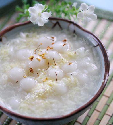 2、煮至湯圓浮起,加糖煮融后熄火即成,食用時可酌加2大匙桂花醬提味。