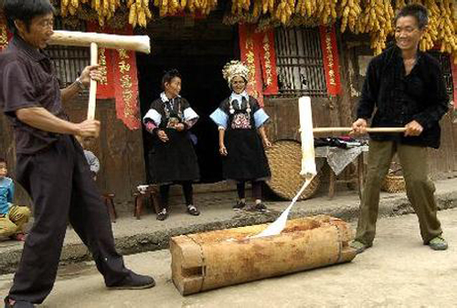 “吃新節(jié)”是苗族集祭祀和娛樂為一體的重要的傳統(tǒng)節(jié)日,苗族稱為“努嘎西” ( 意為吃新米 ) 或“努莫” ( 意為吃卯 ) ,日期各地不一,有的在農歷六月的第一個或第二個卯日過,謂“吃卯”;有的在農歷七月、八月的“丑”、“亥”日過,謂“努嘎西”。“努莫”以孕穗的秧苞為祭品,“努嘎西”以新產香糯為祭品。過節(jié)之前,姑娘們加緊繡制衣裙,小伙們修整和添置蘆笙,男女老少都在為過節(jié)而忙碌。過節(jié)這天,被邀請的客人們穿上盛裝,挑肩糯米飯、肉、魚、雞、鴨等禮品,趕著斗牛來到主人村寨過節(jié)。