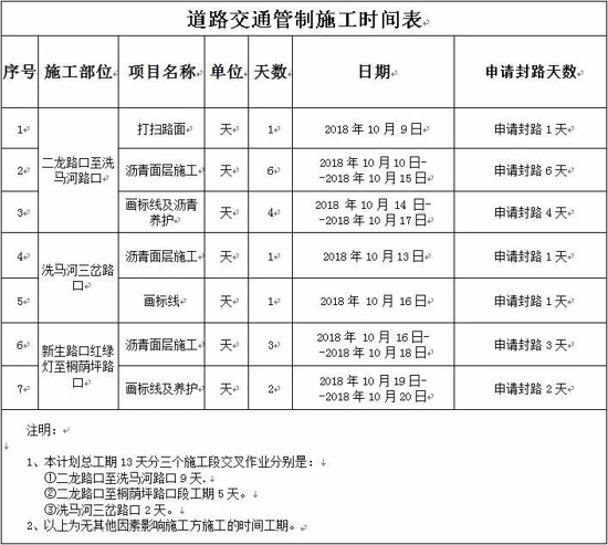 ]]>因凱運大道(桐蔭坪村三岔路口至洗馬河三岔路口)道路建設需要,為保證工程順利施工和是施工期間道路交通安全,經相關部門批準,2018年10月8日晚至2018年10月20日對凱運大道(桐蔭坪村三岔路口至洗馬河三岔路口)實施道路交通管制施工。施工期間禁止社會車輛通行(施工作業車輛除外)。請停放在施工范圍內的車輛在規定時間內將車輛駛離(移走),屆時如有影響施工的車輛,施工方將聯系相關部門強制拖走,施工期間帶來的不便,敬請廣大市民及機動車駕駛人予以理解、支持,并配合施工工作。封閉施工時間表如下:
