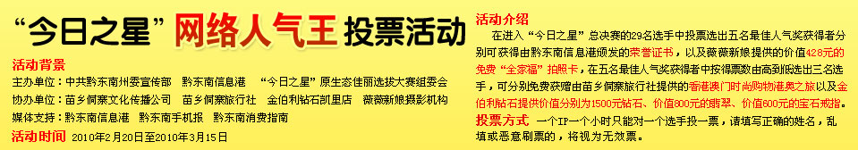 3、其它的選手將有機(jī)會(huì)參加凱里地區(qū)贊助商形象代言人廣告拍攝活動(dòng)。