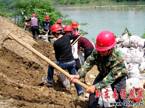 5月16日下午,天氣已很炎熱,人們減少了戶外活動,但在岑鞏縣舞陽河新興段河道治理工程工地上,卻是一片繁忙的建設景象:20余位戴著紅色安全帽的男女工人,正在挖土抬泥,用袋子裝上泥土夯實河堤;挖掘機、推土機、壓路機在大堤上穿梭轟鳴……