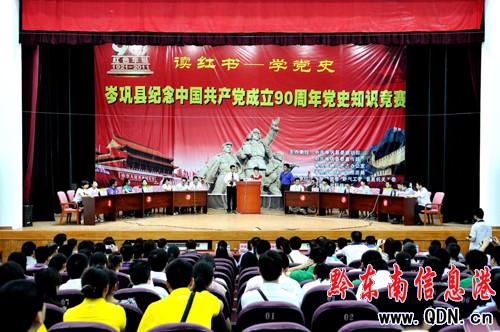 5月20日,該縣在人民會場舉行紀念中國共產黨成立90周年黨史知識競賽,來自全縣各鄉鎮和縣直各部門的28支代表隊84名參賽隊員參加了黨史知識競賽活動。此次競賽是根據4月以前全縣預賽的筆試成績,取前28名進入決賽。競賽試題涵蓋了中共黨史、貴州省黨史、黔東南現代革命史。競賽分為必答題、搶答題和風險題三種題型。競賽過程中,各代表隊參賽選手準備充分,信心百倍,你追我趕,不分上下,競爭激烈,現場掌聲陣陣。經過激烈角逐,最終決出了各項獎次,達到了競賽目的。