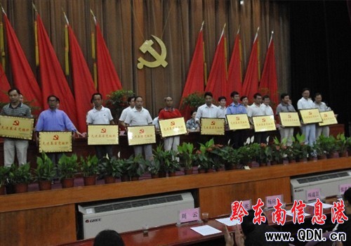 據悉,本次表彰活動本著“熱烈、隆重、節儉”的原則開展,對評選出的50個先進基層黨組織進行授牌,對100名優秀共產黨員、50名優秀黨務工作者和5個勤政廉政先進集體、30名勤政廉政先進個人頒發榮譽證書和每人飲水杯1只的紀念品,寄寓了“飲水思源,永感黨恩”的深意。進一步激勵廣大黨員、干部加強黨性修養,以更加飽滿的工作激情投身到該縣的經濟、文化和社會建設中來。圖為該縣縣委領導班子正在對獲獎組織和個人進行頒獎。(楊政權)