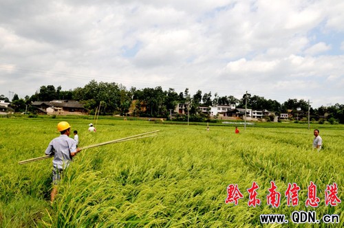 連日來,在岑鞏縣大有鄉臘恰畈村的千畝雜稻制種基地上,全村老少齊上陣,一個個拿著長竹竿,走進正在抽穗揚花的稻田里,為雜稻趕花授粉,他們忙碌的身影已被淹沒在長勢良好的稻穗間。由于該村具有得天獨厚的自然條件,大旱之年水源依然充足,一眼望不到邊的綠色雜稻田里,開始泛出金黃的顏色,呈現出豐收在望的喜人景象。(張維軍)