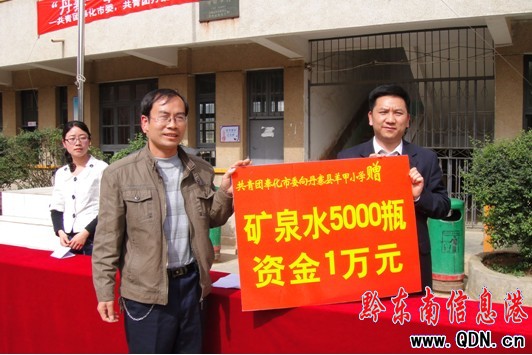 4月27日,“丹寨--奉化一家親,抗旱御災永真情”——共青團奉化市委、共青團丹寨縣委赴龍泉鎮羊甲小學送水獻愛心活動在羊甲小學舉行。共青團丹寨縣委代表團奉化市委向受災嚴重的龍泉鎮羊甲小學捐贈礦泉水200件5000瓶,資金1萬元