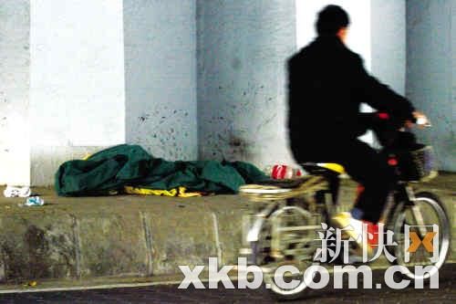 昨日上午9時許,記者在天河立交橋底看到,死者躺在橋下的人行道上,光著的腳已伸到馬路上。死者身穿黑色外套和褲子,看起來身體很單薄,身下墊著一床淺黃色被單,雙腿并攏,雙手呈抱頭狀。不遠(yuǎn)處的角落里,零散放著幾張報紙和數(shù)件破舊的衣服。