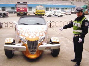 “當了這么多年交警,還真沒見過這樣的車!”在現場,執勤交警驚奇不已。細看之下,該車車頭兩側伸著兩個手柄狀的東西,前車輪凸出在外部,銀灰色的車身上,布滿了橘紅色的火焰紋,從正前方看,很像三輪車。但轉到側面,就能清晰地看出了一輛頂級跑車的輪廓,底盤很低,輪胎很寬,上方為軟頂敞篷。來到車后部,交警一番對比后,這才確認懸掛的外文車牌實際上是美國加州的號牌。據駕車人錢先生介紹,這是輛克萊斯勒“獵獸”限量版頂級跑車,身價300萬元,目前大陸地區僅有幾輛,不過這不是新車,而是他從美國購置的二手車,目前相關手續已經齊備,正準備選個日子去車管所換牌。