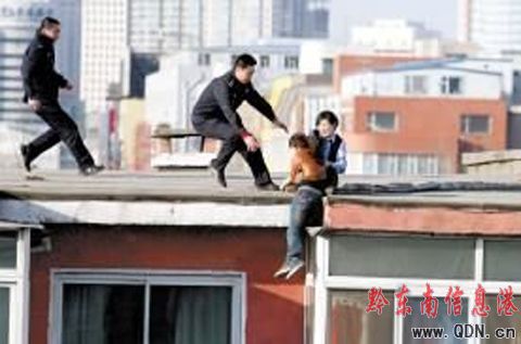 危急時刻,一名開車路過的女警察自告奮勇爬到樓頂,想辦法接近女子。一個多小時后,該女子從樓邊翻下,千鈞一發之時,女警伸手死死地拉住了她。