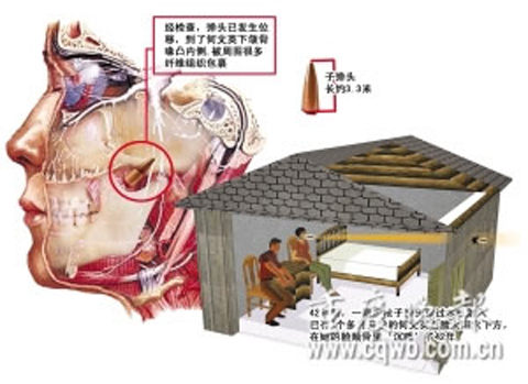 42年前,一顆長約3.3厘米的步槍子彈射入何文英右臉太陽穴下方,彈頭呆在在她的右臉頰里。昨日,大坪醫院頜面外科專家將彈頭成功取出,這顆彈頭已銹蝕。彈頭雖在何文英右臉頰里呆了42年,卻沒對何文英造成嚴重傷害。