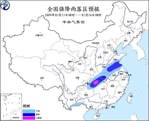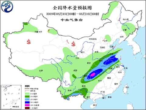 中央氣象臺2009年5月15日06時繼續發布暴雨預報: