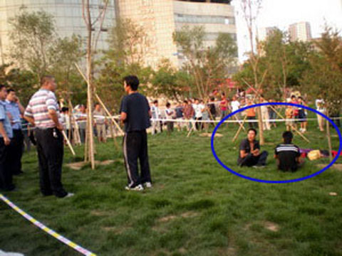 25日18時50分,現場已經拉起了警戒線。草坪上一棵小樹下,女子頭枕在一個紅色旅行包上,兩件衣物蓋住了頭部和下體。三名男子呆坐在死去的女子一側,警戒線外圍滿了圍觀者。