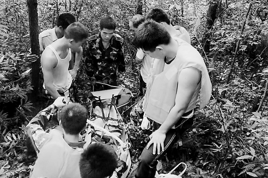 救援人員背著擔架、皮劃艇等救援工具進入森林,順著老葉指引的方向走了近4小時,終于在一個山腳下找到了無力動彈的馮老太。