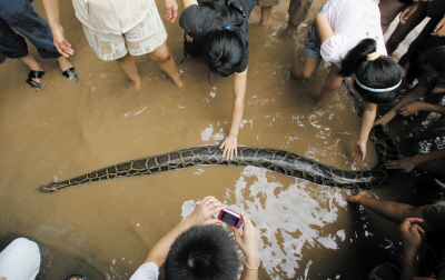 婦女扛4米長蟒蛇到江邊為其洗澡嚇跑市民(圖)