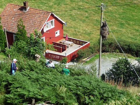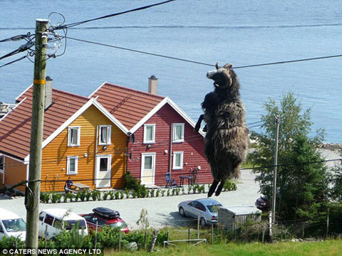 大洋網(wǎng)肖消息 本周三,在挪威的一個小鎮(zhèn),發(fā)生了一件讓人啼笑皆非的事情。一只正在山頂上吃草的山羊,懷疑看到山腳下有一群母羊,急忙往山下沖時,羊角不小心掛到了山頂上的一條電纜。它不停地掙扎,卻越掙扎越麻煩,竟然順著電纜線滑向了山腳下,到山下時已經(jīng)離地五六米高,懸在半空中。它害怕地不停咩咩叫,附近的一群德國游客聽到叫聲抬頭望去,都不禁啞然失笑。于是大家一起七手八腳地趕過來救它。又是繩子又是竹竿的忙活了差不多一小時,才把它救下來。幸運的是,這只羊既沒有被電到,也沒有摔傷。