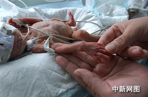 中國新聞網消息 鄭州市兒童醫院新生兒病區重癥監護室暖箱里,有一位皮包骨頭、體重僅700克的超低體重早產女嬰,其四肢如成人拇指般粗細,軀體還沒有護士手掌大,被稱為“拇指女嬰”,令人倍加愛憐。
