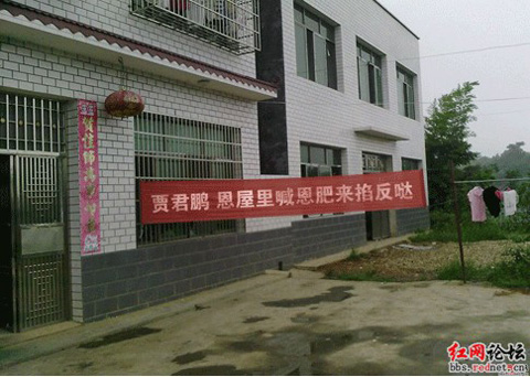 也有網友并不買賬,認為那是經過電腦軟件PS出來的圖片,并不真實,于是爭相在帖子后面跟上自己PS的圖片,將圖片中的標語進行了篡改惡搞,如“賈君鵬恩屋里喊恩肥來掐反噠”、“賈君鵬私人衣服八折”、“參觀賈君鵬故里票價優惠”等,詼諧搞笑,令人忍俊不禁。