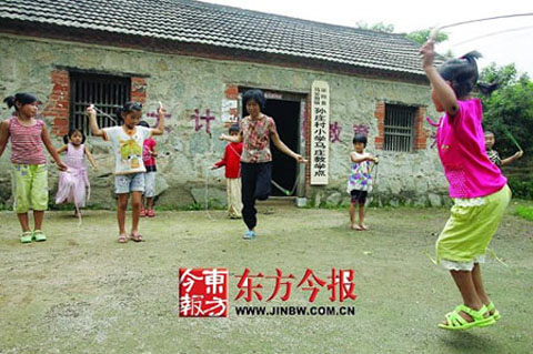課間時(shí)分,徐云玲教19名學(xué)生先做廣播體操,然后又帶學(xué)生跳繩。有幾個(gè)男生手里拿著一只籃球,相互傳來傳去。徐云玲看在眼里疼在心里。她說,打球是男孩子的天性,城里的孩子會(huì)投籃,山里的孩子連個(gè)籃球架都沒有,只能拿籃球相互傳著玩。“誰說山里就出不了姚明這樣的體育明星?”她的心愿有很多,比如:為孩子們蓋一間圖書館,給孩子們弄間電腦室,給孩子們弄些新桌椅,但她最大的心愿還是能為孩子們添置一些體育器材,如籃球架等,讓山里的孩子也能打打籃球投投籃。