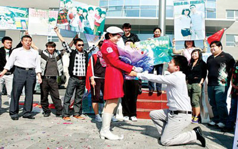 10時20分,隨著部隊首長和領導離開,小陳的朋友跑到主席臺上,通過話筒向全場廣播:田雨晨,國旗桿下有人向你求婚!
