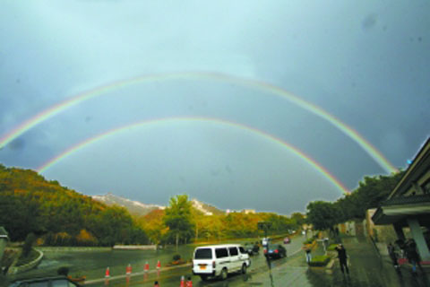 八達嶺長城雨中同現鴛鴦彩虹(圖)