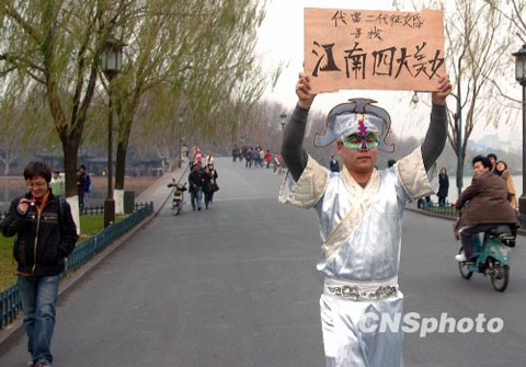 中國廣播網(wǎng)消息 12月23日下午,在杭州西子湖畔白堤,一著古裝男子,頭戴著面具,舉一塊上書“代富二代征婚,尋找江南四大美女”木牌替人征婚,引來眾人好奇的目光。當(dāng)問及是哪一位富二代時,該男子拒絕透露。