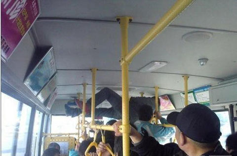 網友曝最強公交售票員在乘客頭頂售票(圖)