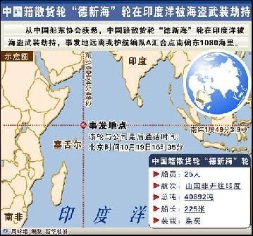 2009年10月19日,青島遠(yuǎn)洋運(yùn)輸公司所屬“德新海”輪在印度洋被索馬里海盜劫持,船上有中國(guó)船員25名。事件發(fā)生后,中國(guó)政府高度重視,有關(guān)部門(mén)和企業(yè)積極開(kāi)展?fàn)I救,確保被劫船員船只安全。