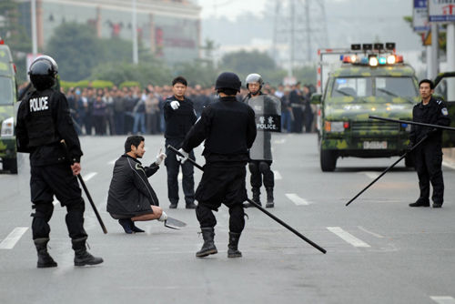 南方網1月27日報道 “我們是東莞特警,放下手中的武器,否則我們將采取行動!”擴音器中傳來嚴肅的喊話聲,一名手持長刀的男子遲疑了一下。20余名特警組成的包圍圈在逐漸縮小,“行動!”一聲令下,特警一擁而上,將提刀男子制服——這一幕發生在四環路景湖藍郡附近。