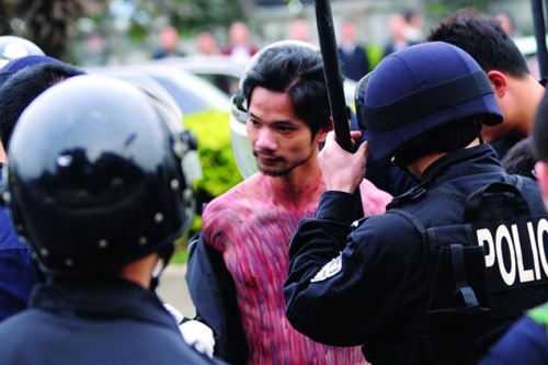 昨日下午,他從菜市場拿了兩把殺豬刀,喝了罐紅牛,還打電話通知了記者。接著沖上東莞四環路,開始一遍遍地劈砍路旁一家建筑公司的大門。結果被警方圍困,最終束手就擒。