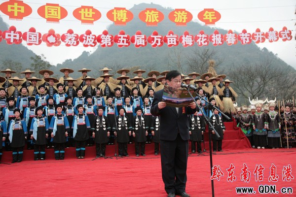 荔波縣委書記閔路明到歡迎詞,他說:“舉辦此次萬畝梅花報春節活動,目的在以旅游觀光為媒介,搭建一個讓外界了解荔波、讓荔波走向世界的交流平臺,歡迎世界各地游前來荔波參觀、旅游。
