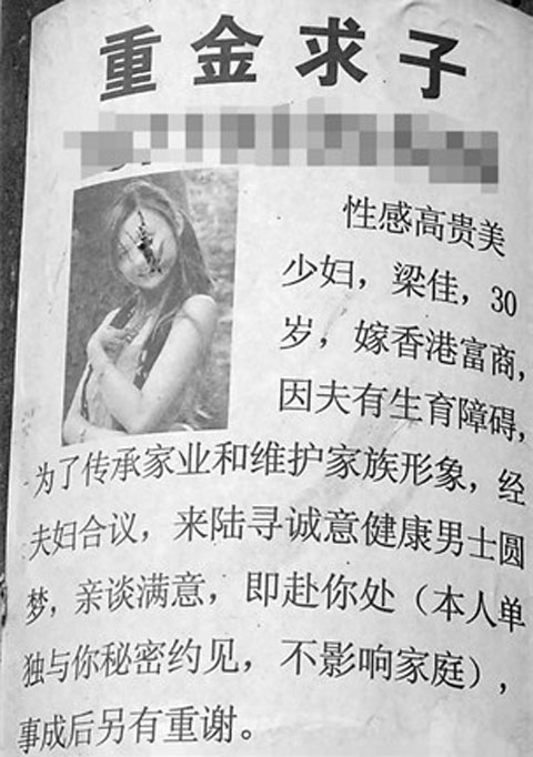 這個(gè)小廣告就貼在余杭某廠附近的電線桿上,周圍是一片荒地。上面真有個(gè)漂亮女人的照片,俏生生地歪著腦袋在笑。文字不長(zhǎng):“性感高貴美少婦,嫁香港富商,因夫有生育障礙……秘密約見,不影響家庭,事成后重謝。”