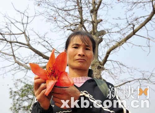 在一處山坡上,丁順瓊看到了希望。這是一棵十幾米高的老木棉樹,枝頭上綴滿大朵火紅燦爛的木棉花,但最近的樹枝距離地面也有4米高。同行的人上前幫忙,與丁順瓊一起,撿起地上的石頭、木棍往樹上扔,希望能像打野果一樣砸下一兩株花朵。大家費了九牛二虎之力,累得氣喘吁吁,只有丁順瓊一人幸運地砸下一朵。