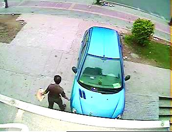 昨日清晨5時許,查看監控器的車主發現,一名男子走進停車場,抓著一個草帽,他四下觀望一番,從草帽中拿出一個物品,靠近一輛藍色汽車,俯身朝右前車胎扎去,隨后走到右后側,又扎破了右后輪才匆匆離去。