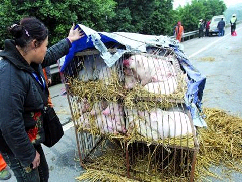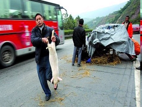 貨車側翻58只豬崽在高速路亂竄 交警抓豬忙(圖)