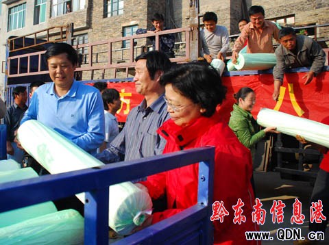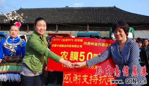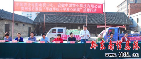 本港訊 (秦昊茗 特約記者 黃曉海 攝影報(bào)道)4月29日,中國(guó)農(nóng)業(yè)電影電視中心鄭學(xué)莉副書記、安徽中誠(chéng)塑業(yè)科技有限公司胡雪林總經(jīng)理等一行來(lái)到丹寨縣開展“手挽手抗干旱愛心地膜”捐贈(zèng)行動(dòng),向丹寨縣捐贈(zèng)價(jià)值約80萬(wàn)元的抗旱地膜50噸。丹寨縣縣長(zhǎng)龍先金主持了當(dāng)日的捐贈(zèng)儀式,丹寨縣委書記古鵬在儀式上作了重要講話,他表示,2009年7月以來(lái),丹寨境內(nèi)出現(xiàn)了夏秋冬春四季連旱罕見現(xiàn)象,造成直接經(jīng)濟(jì)損失8162萬(wàn)元,是黔東南州受災(zāi)最重的縣份。