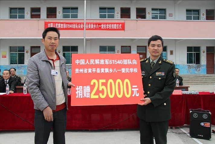 在當天的歡迎儀式上,中國人民解放軍61540部隊政委景賢舫代表部隊全體官兵,現場向八一愛民學校全體師生捐贈資金25000元,以幫助學校進一步改善辦公條件。景賢舫政委表示:61540部隊全體官兵將永遠發揚紅軍二萬五千里長征精神,堅決弘揚當代革命軍人的核心價值觀,永遠關心我們革命老區校園的建設,永遠關注八一愛民學校全體師生的工作和學習。希望全體師生,更加勤奮工作,踏實學習,努力建設革命老區的美好未來。