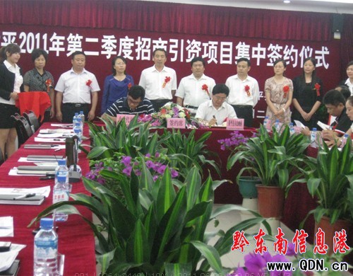 6月28日,黃平縣2011年第二季度招商引資項目集中簽約儀式在該縣行政中心隆重舉行。當天共投資的項目有11個,其中,簽訂正式投資協議6個,總投資2.4825億元,意向性協議5個,總投資7.05億元。