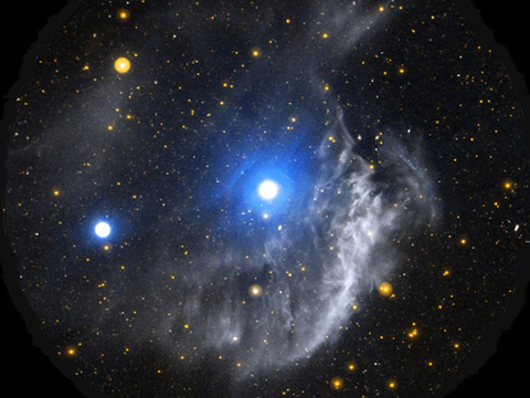 美國宇航局“星系進化探測器”拍攝到NGC 3242行星狀星云附近的這幅紫外線圖像,該圖像被稱為“木星的幽靈”(其中心位置有藍色和白色區域),它距離地球1400光年,位于長蛇星座。當類似太陽的恒星耗完燃料之后,它們將演變成紅巨星,該行星狀星云中其他一些膨脹的恒星拋棄它們的外層氣體,最終暴露出由碳和氧氣構成的濃密內核,它們叫做白矮星。白矮星所釋放的紫外線照亮了周圍的氣體,形成行星星云。雖然類似太陽的恒星已存在了數十億年,但行星狀星云僅能存在1萬年左右。
