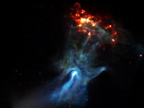 B1509脈沖星將延伸抵達叫做RCW 89的氣體云,在這個區域宇宙風點亮了氣體節狀結構,使它們在X射線范圍下發出明亮光(圖像右上端的可見橙色和紅色部分)。該氣體云呈現出圓形圖案,這暗示著這顆脈沖星像一個抽陀螺一樣處于旋動狀態。它距離地球1.7萬光年,估計它已存在大約1700年。這張“宇宙之手”圖像是由錢德拉X射線望遠鏡拍攝的。