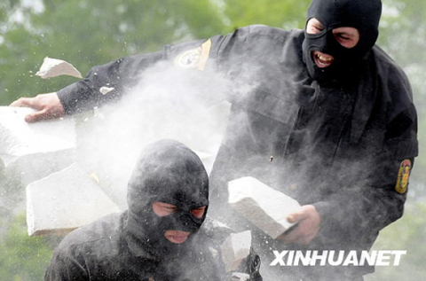 5月19日,在白俄羅斯首都明斯克舉行的第五屆國際武器裝備和軍事技術展“米列克斯-2009”開幕式上,白俄羅斯特種部隊隊員表演頭頂碎石。為期四天的第五屆國際武器裝備和軍事技術展吸引了來自約40個國家的軍方代表團和企業(yè)參加。