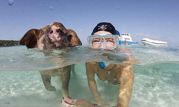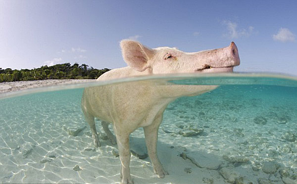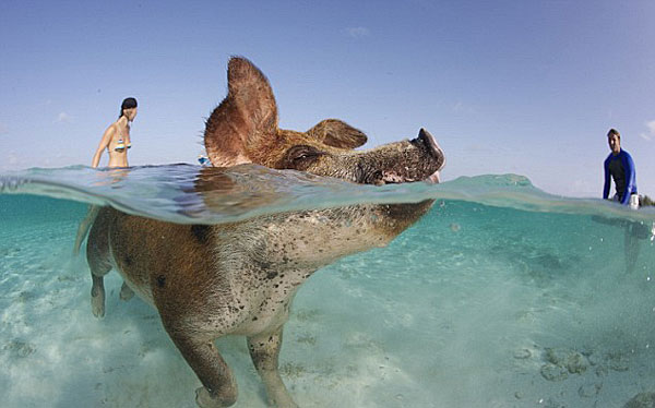 這些野生的豬很善于游泳,當地人和游客都很喜歡他們,他們來到清澈見底的海里游玩時,都會與這些豬豬進行親密的接觸。