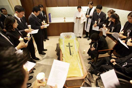 儀式過程沒有對(duì)外公開,只有金大中的遺屬和一些工作人員參加。金大中生前的秘書崔敬煥說,“金大中穿著夫人李姬鎬事先準(zhǔn)備的壽衣,被安置在繪有鳳凰(象征總統(tǒng)地位的標(biāo)志)的棺木里。”
