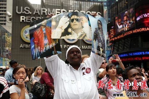 7月7日下午的紐約時代廣場,多個大屏幕電視都在直播在洛杉磯斯臺普斯中心舉行的邁克爾.杰克遜公眾追悼會,引來許多路人觀望駐足。