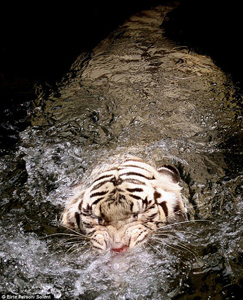白虎一般皮膚呈白色,上面有黑色條紋,長著藍色的眼睛和粉色的鼻子。皮爾森說,來到動物園時,剛好趕在老虎們“喝下午茶”的時間。她說:“它們坐在巖石上等著管理員扔下第一口食物,然后突然躍入水面。它們之間瘋狂爭搶,直到吃飽。新加坡是世界上白虎最多的國家!