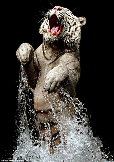 一只白色孟加拉虎躍出水面,露出長牙仰天咆哮,準備搶食管理員扔下的食物。來自澳大利亞新南威爾士的攝影師波特·皮爾森在新加坡動物園抓拍到了白虎進食的畫面,當時這只孟加拉白虎和其他五只老虎正大秀捕獵技巧。