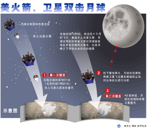 美航天局發(fā)表新聞公報說,半人馬座火箭、月球坑觀測和傳感衛(wèi)星10月9日相繼撞擊了月球南極附近的凱布斯坑,重約2.2噸的半人馬座火箭撞月后激起了兩部分塵埃:一部分由蒸汽和微塵組成;另一部分由質(zhì)量更重的物質(zhì)組成。月球坑觀測和傳感衛(wèi)星攜帶的光譜儀對塵埃進行了分析。