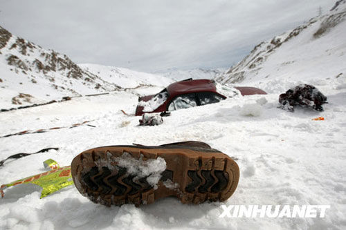 在一輛已被挖出來的白色公交車殘骸前,白色積雪上星星點點地染上了遇難者的鮮紅血跡,在陽光下顯得分外刺眼。