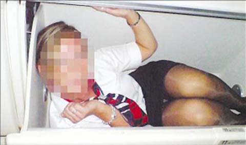據報道,這些艷照顯然是英國航空公司的幾名空姐在飛機航班上工作之余抽空拍下來的,照片上的這些空姐大多穿著英國航空公司的空姐專門制服,有的胸前還掛著工作牌。這些曝光的艷照顯示,有的空姐對著攝像鏡頭撩起了她們的藍色裙子,故意露出她們穿著長絲襪的性感大腿和赤裸臀部;有的空姐手拿拖把擺出打掃衛生的姿勢,可她們卻故意將身前的裙子撩到大腿根部,擺出“性感清潔工”的造型;還有的空姐蜷縮著躺在狹小的手提箱櫥柜中,故意充滿誘惑地露出內褲的顏色。