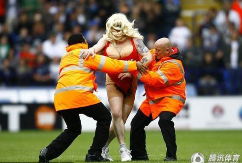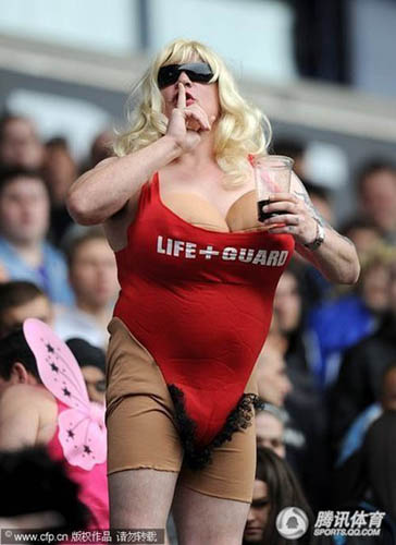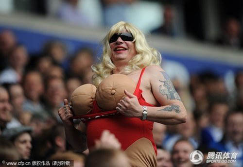 2010年5月9日,英國博爾頓,09/10英超第34輪,博爾頓Vs伯明翰,“重口味”球迷戴著“義胸”假扮婦女鬧賽場。
