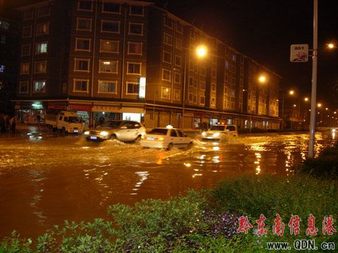 接到群眾報告后,縣城管局、環(huán)衛(wèi)站等部門迅速組織人員疏道清理街道各下水道口,確保洪水排泄。經(jīng)30余分鐘的奮戰(zhàn),城區(qū)水位逐漸下降,交通恢復(fù)正常。圖為縣城仰阿莎大道成“河流”的情景。