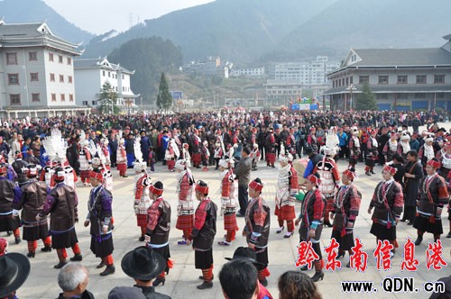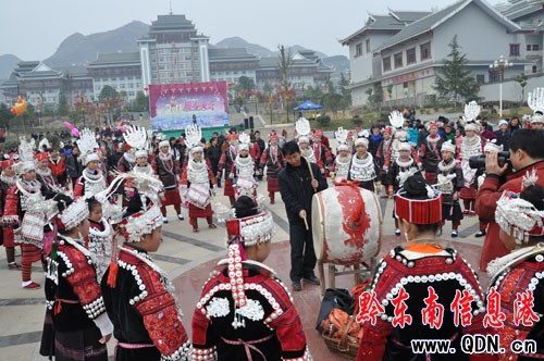 1月6日,劍河縣千名苗族同胞身著節日盛裝聚集在陽光廣場舉行踩鼓活動,祝愿兔年生活蒸蒸日上。當天,吸引近萬名群眾前來觀看。